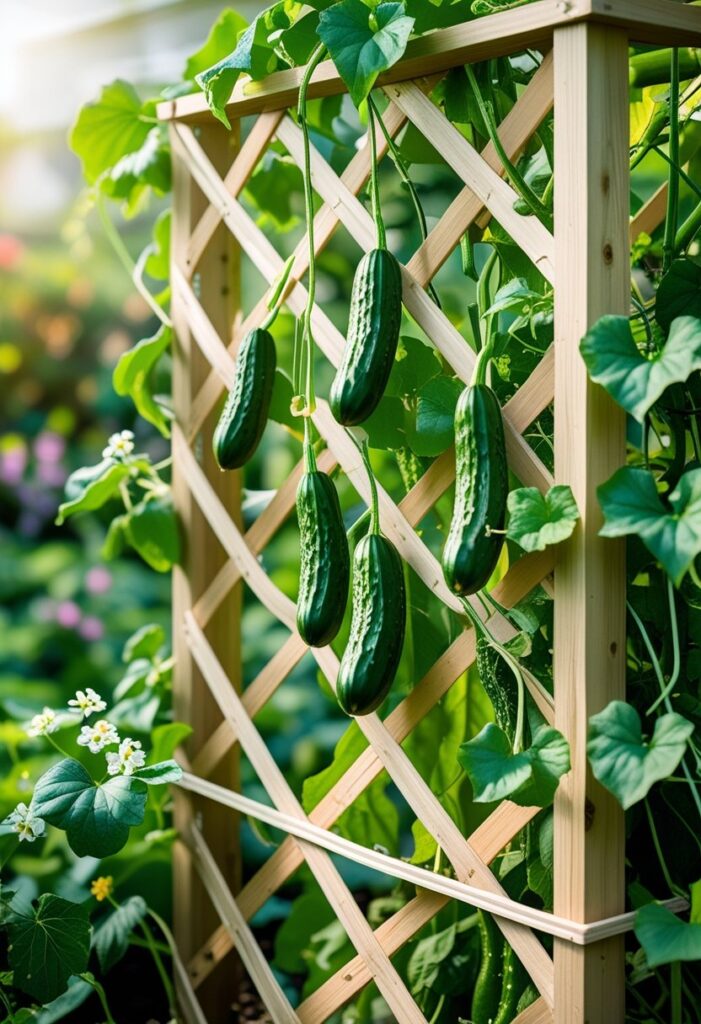 A wooden lattice panel offers a simple and effective way to grow cucumbers vertically. It provides a sturdy framework for cucumber vines to climb, which helps save space in the garden.