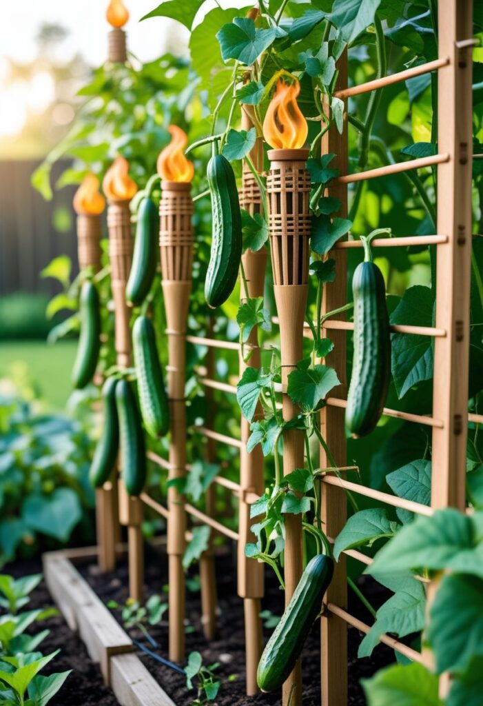 For more ideas on using tiki torches as a cucumber trellis, see creative vertical growing options at treevitalize.com.