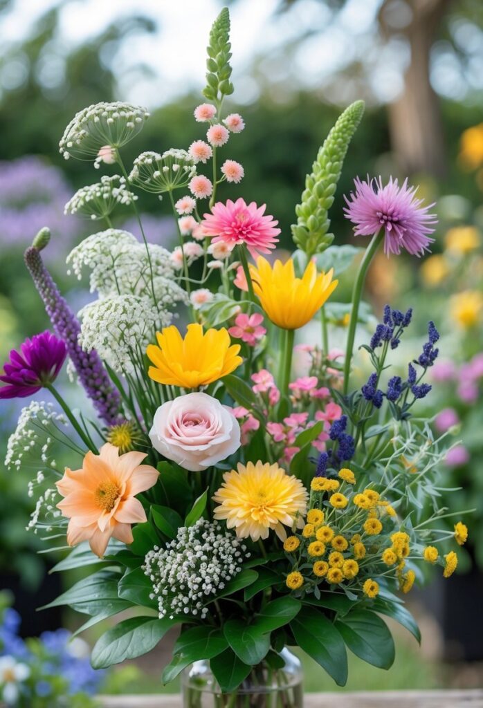 Dahlias and zinnias are top choices for bright, long-lasting blooms. Snapdragons and lisianthus add elegant vertical shapes. Sunflowers create bold, eye-catching focal points. Scented flowers like sweet peas and stocks bring fragrance. Baby’s breath and limonium work well as filler flowers for texture.