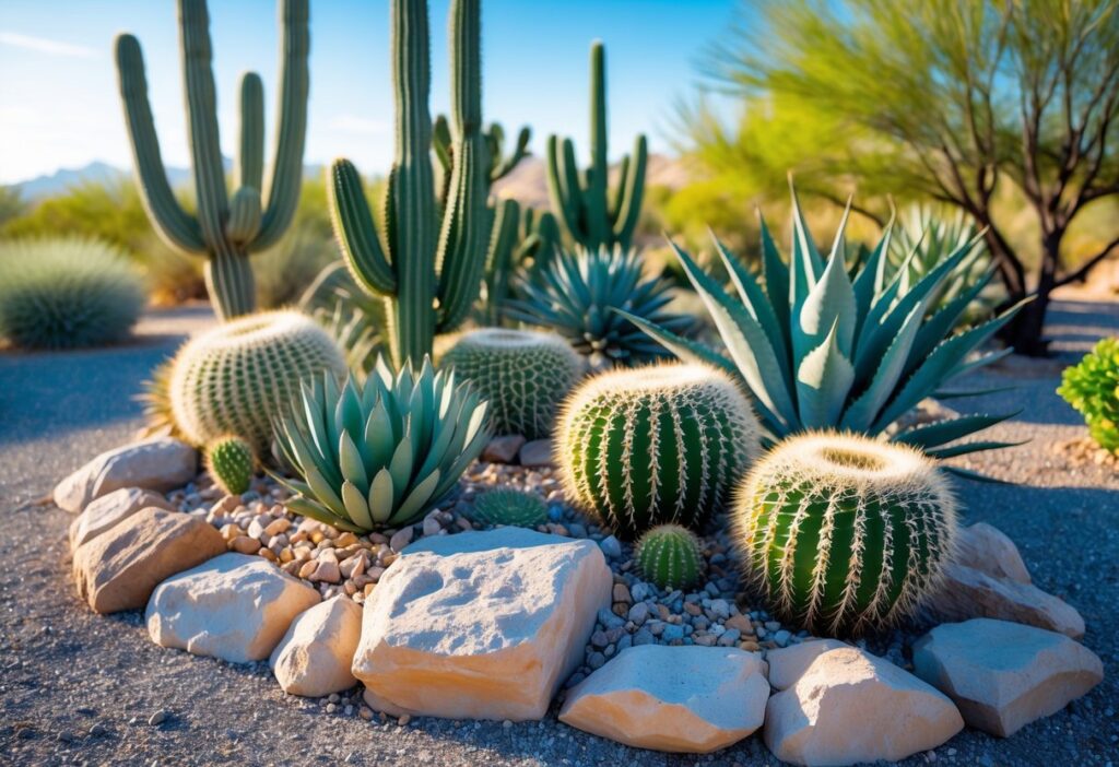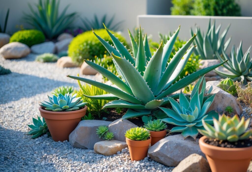 Agave plants make bold focal points with their strong shapes. Aloe vera adds easy-care greenery and also has practical uses. Other succulents and cacti work well because they store water and thrive in dry soil.