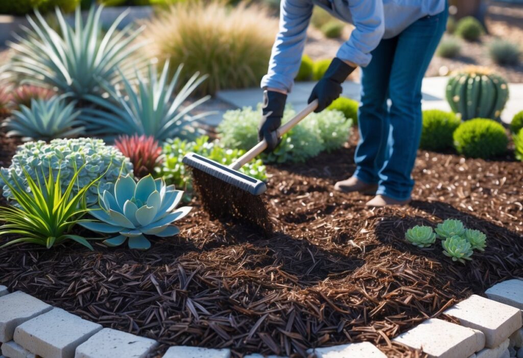 Mulching is important. It reduces water evaporation, regulates soil temperature, and cuts down on weed growth. Using mulch such as wood chips, gravel, or decomposed granite is beneficial for dry gardens.