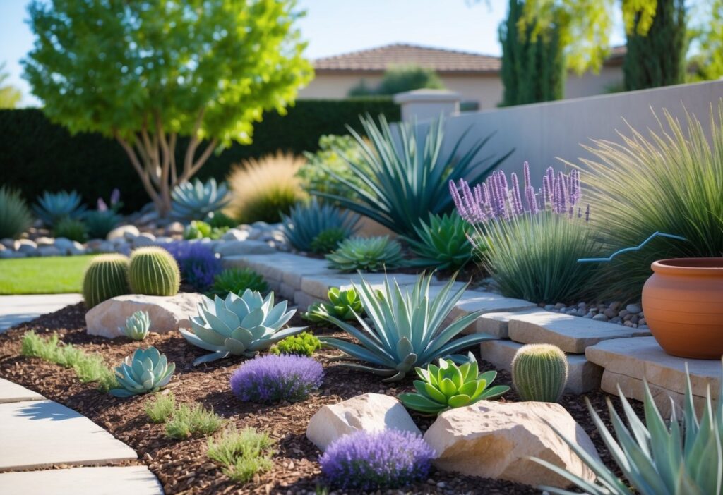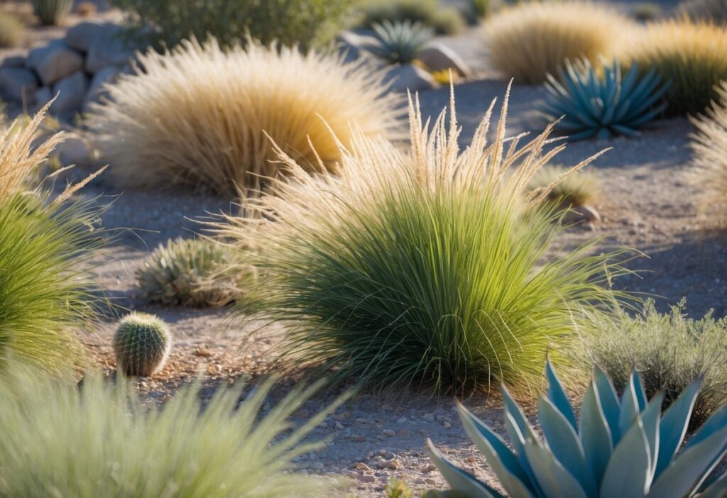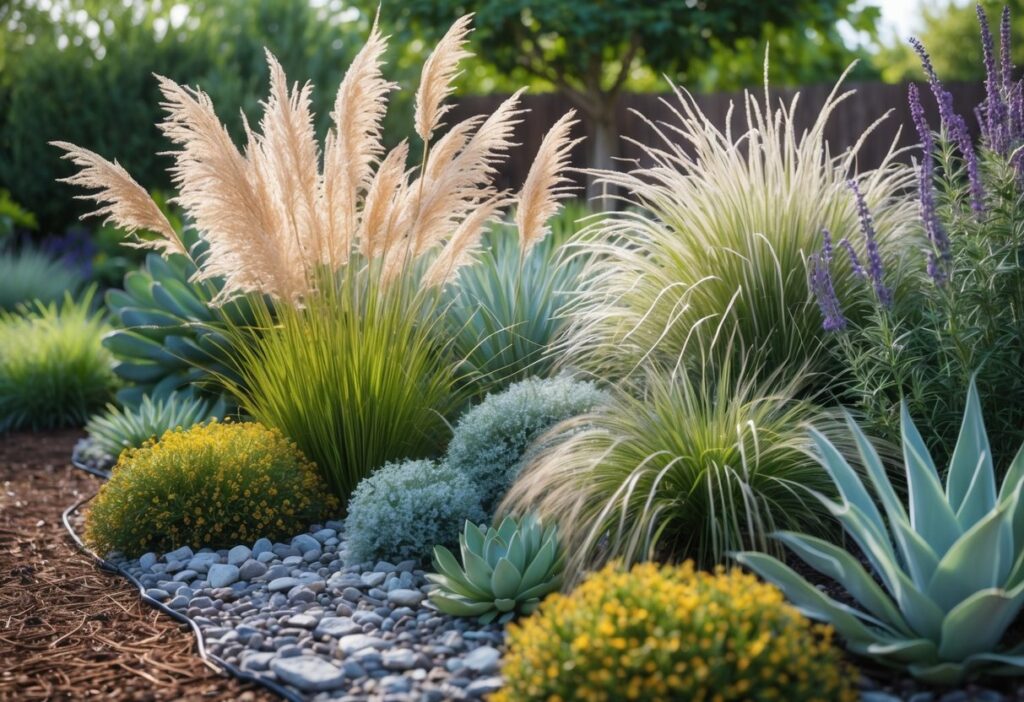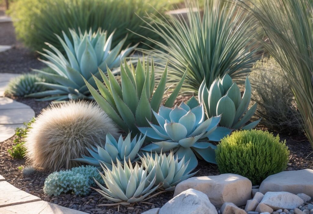 Succulents with thick, pointed leaves work well alongside tall, narrow grasses. This contrast adds depth and height to the landscape without extra water needs.