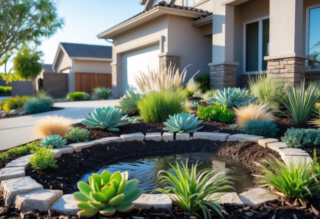 Installing a rain garden in the front yard helps recycle rainwater. It reduces the need for extra watering during dry periods. This method fits well with drought-tolerant landscaping goals.