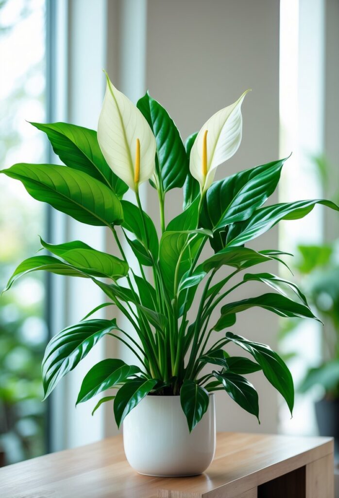 The peace lily is a popular houseplant known for its elegant white flowers and glossy green leaves. It thrives in low to bright indirect light, making it easy to place in many indoor spaces.