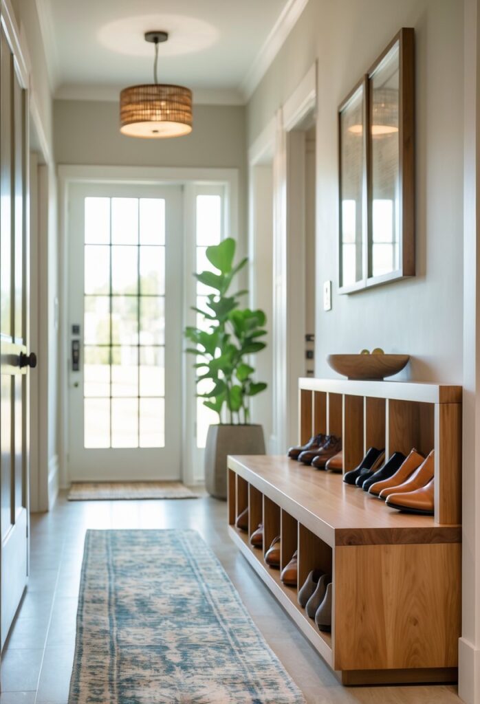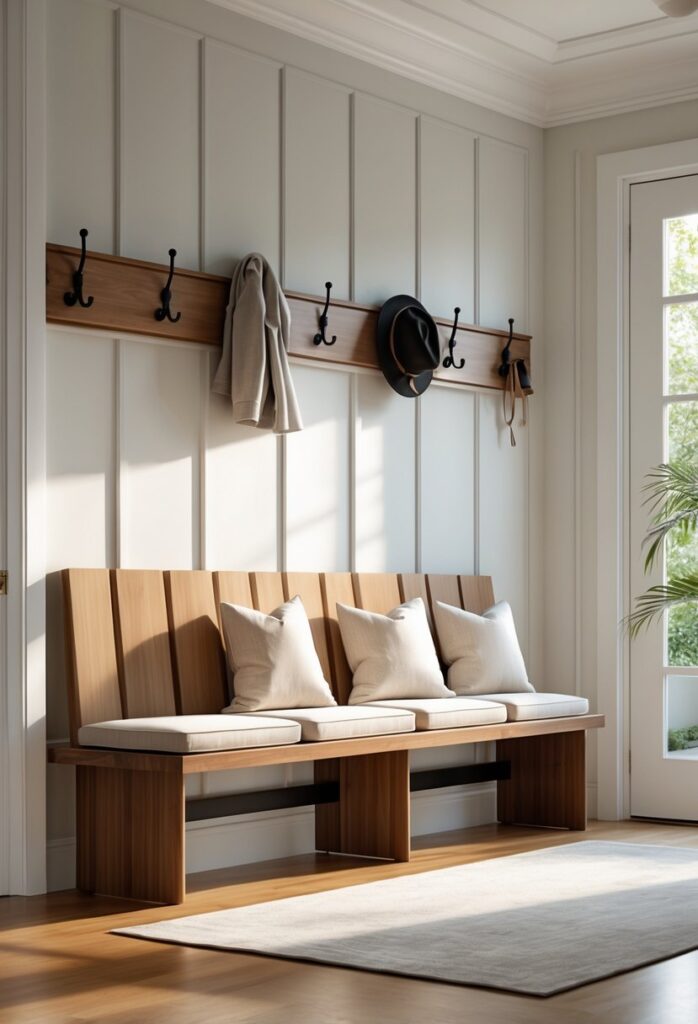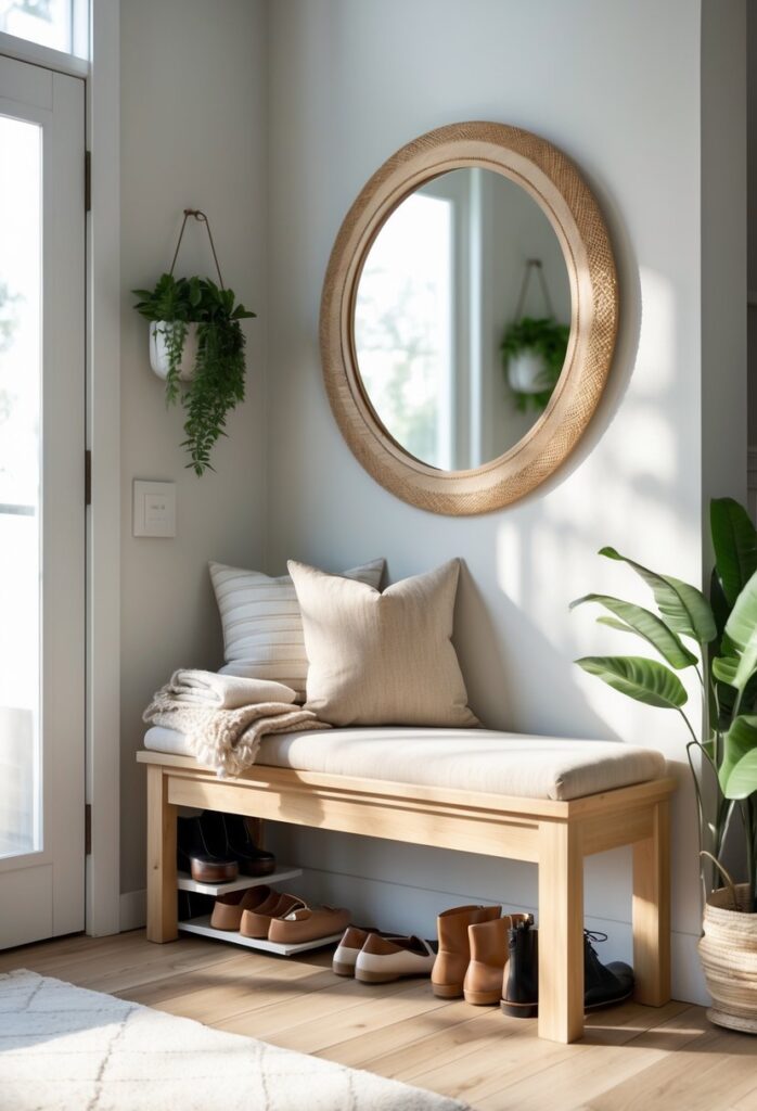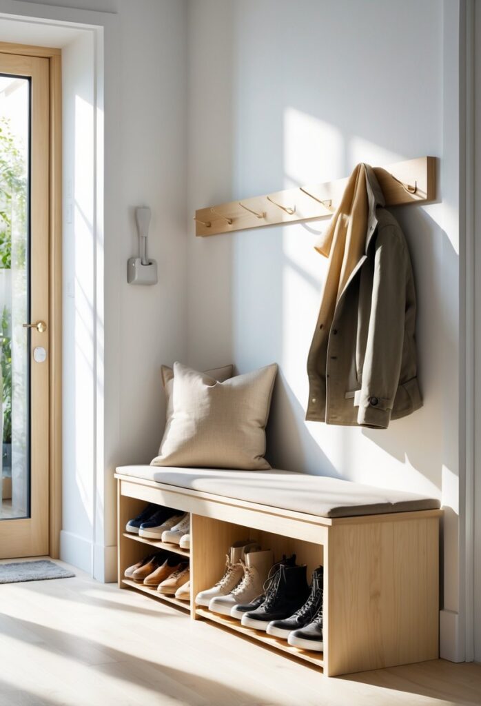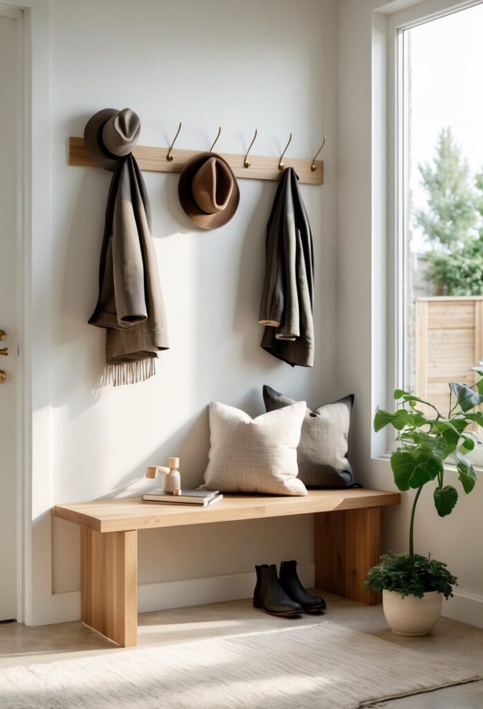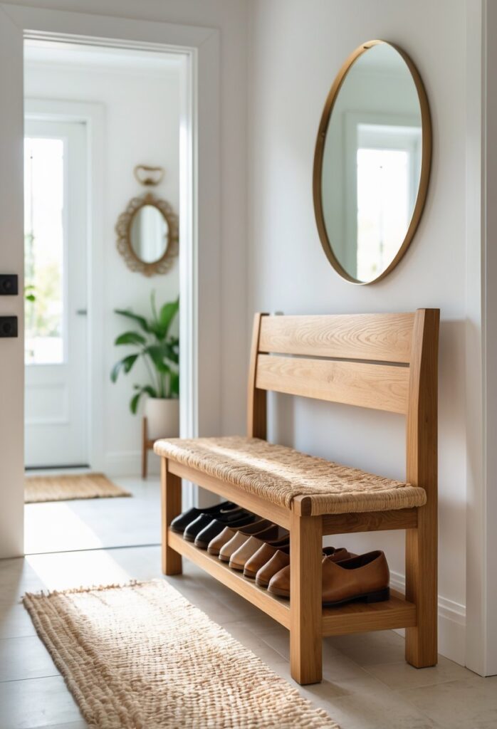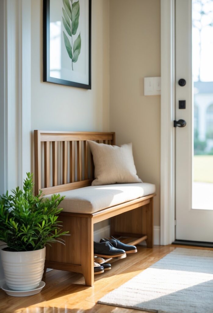 The bench should not block door swings or narrow spaces. If the entryway is small, choose a bench with slim dimensions or built-in storage to maximize use. Layering the space with a rug or cushion adds comfort and shows attention to detail.