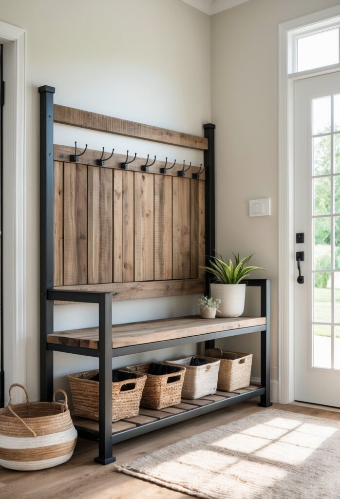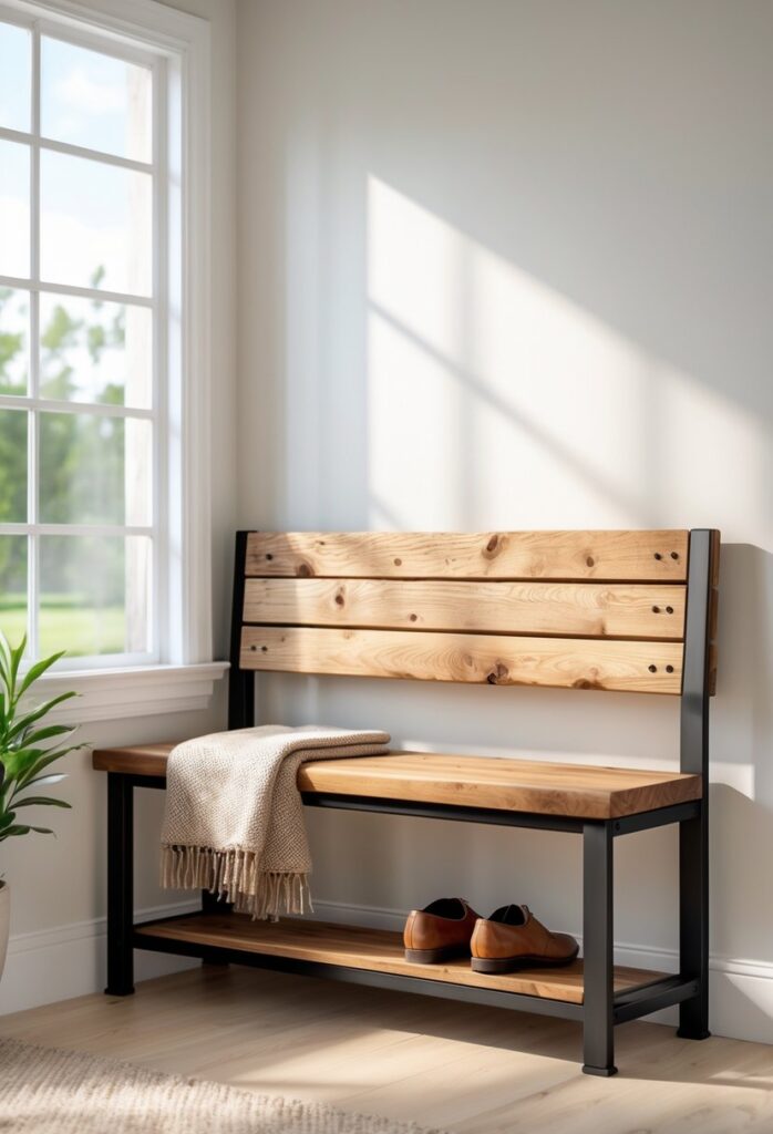 This bench blends wood and metal materials for durability and style. It suits entryways with rustic or modern farmhouse decor.