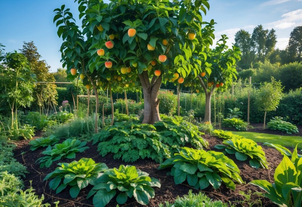 Planting standard-sized apple, peach, plum, or pear trees gives a solid foundation to the food forest. These trees usually need space, about 15-20 feet apart, to allow sunlight to reach lower plants and to develop healthy crowns. This spacing supports better growth and fruit production.