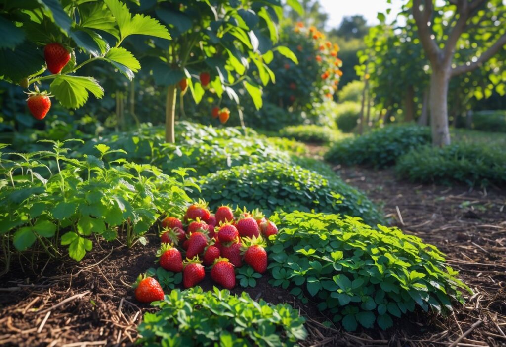 Edible groundcovers such as strawberries and creeping thyme serve a dual purpose in a food forest. They cover the soil densely, which helps block sunlight from reaching weed seeds. This natural weed suppression reduces the need for manual weeding or chemicals.