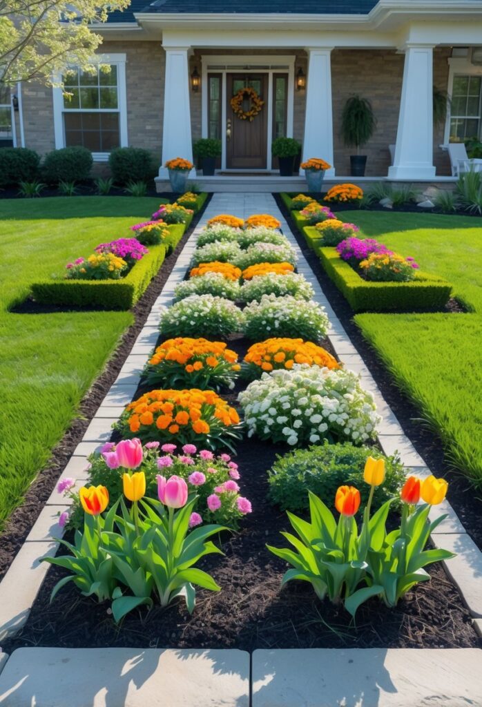 Symmetrical flower beds on each side of the walkway create a balanced and orderly look. This design draws the eye toward the entrance and gives the yard a neat, intentional feel.