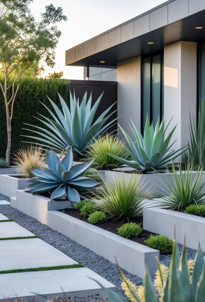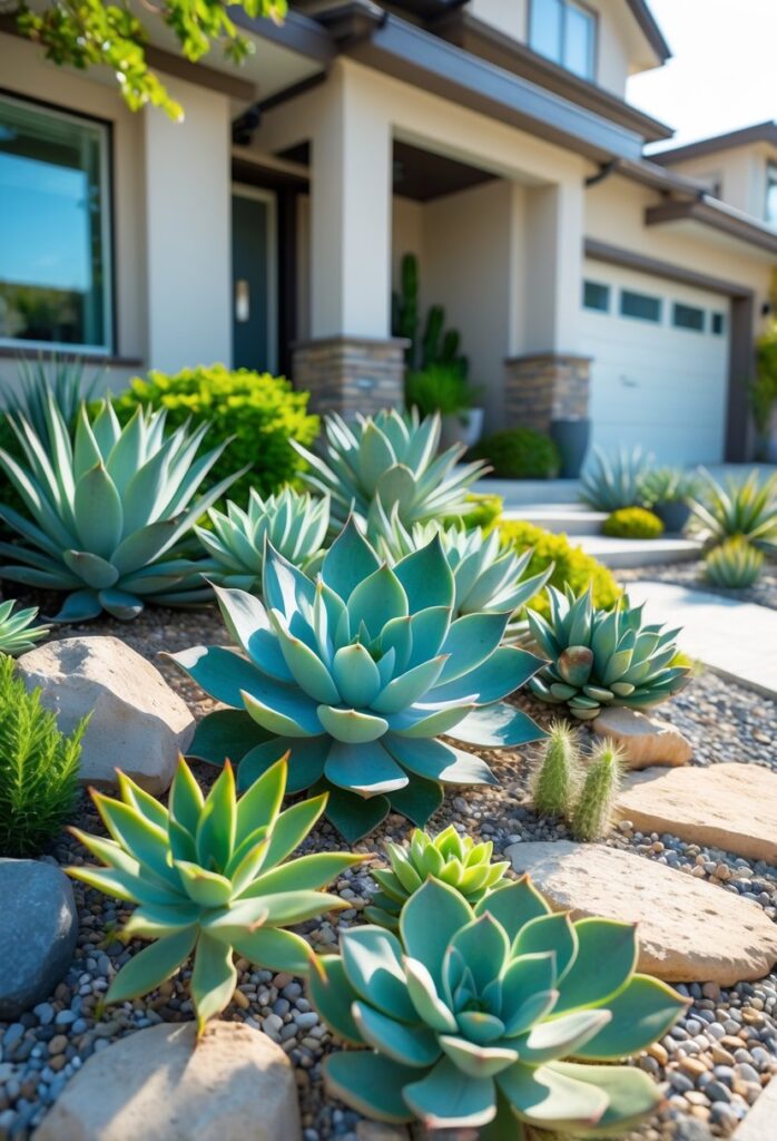 More ideas for using succulents in front yard landscaping can be found in a collection of low-maintenance succulent garden ideas.