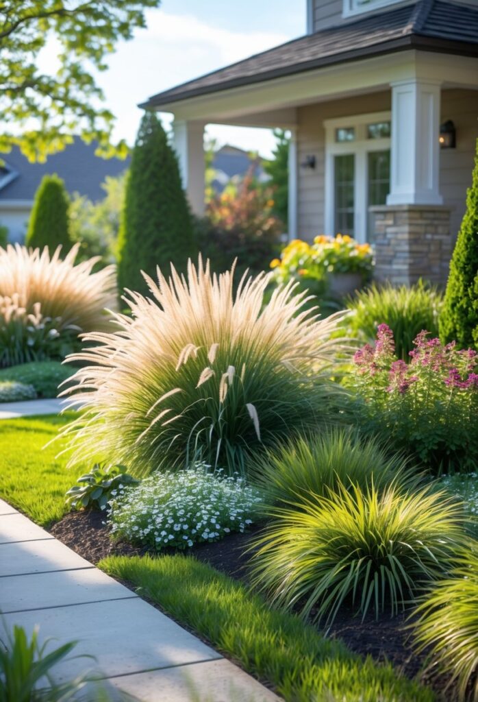 Ornamental grasses add texture to a front yard without much care. Their tall, slender blades create movement when the wind blows, giving the space a natural feel. These grasses can soften hard edges and break up large areas of lawn.