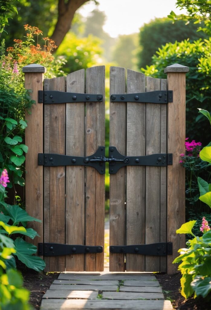 A rustic wooden gate with iron hinges offers a strong and classic look for any garden. The natural texture of the wood adds warmth and fits well with outdoor spaces. Iron hinges bring durability and a traditional touch that complements the gate’s rugged style.