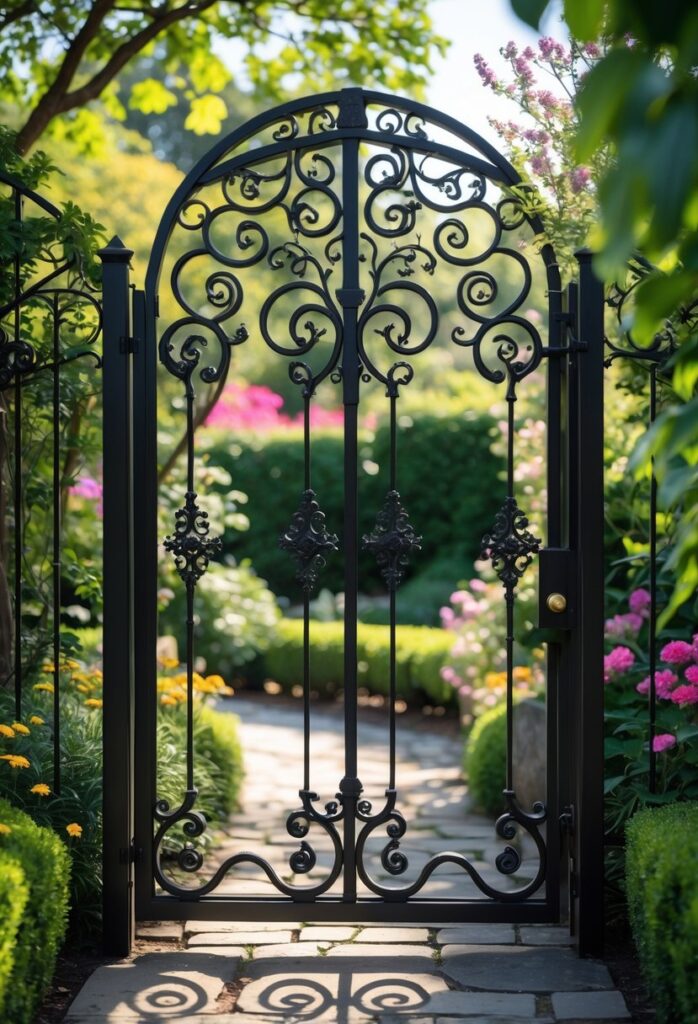 A wrought iron gate with scrollwork combines strength with detailed design. The scroll patterns add a classic look that fits many garden styles. This type of gate often features curves and twists that create a visually pleasing entrance.