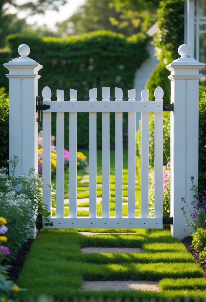 A white picket gate with a classic design is a timeless choice for many gardens. It often features evenly spaced vertical slats and a simple, clean shape that fits well with traditional home styles.
