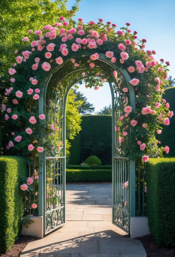 An arched gate covered with climbing roses adds a soft, natural look to any garden entrance. The arch creates a clear frame, while the roses bring color and texture. This combination invites visitors in with a gentle, welcoming feel.