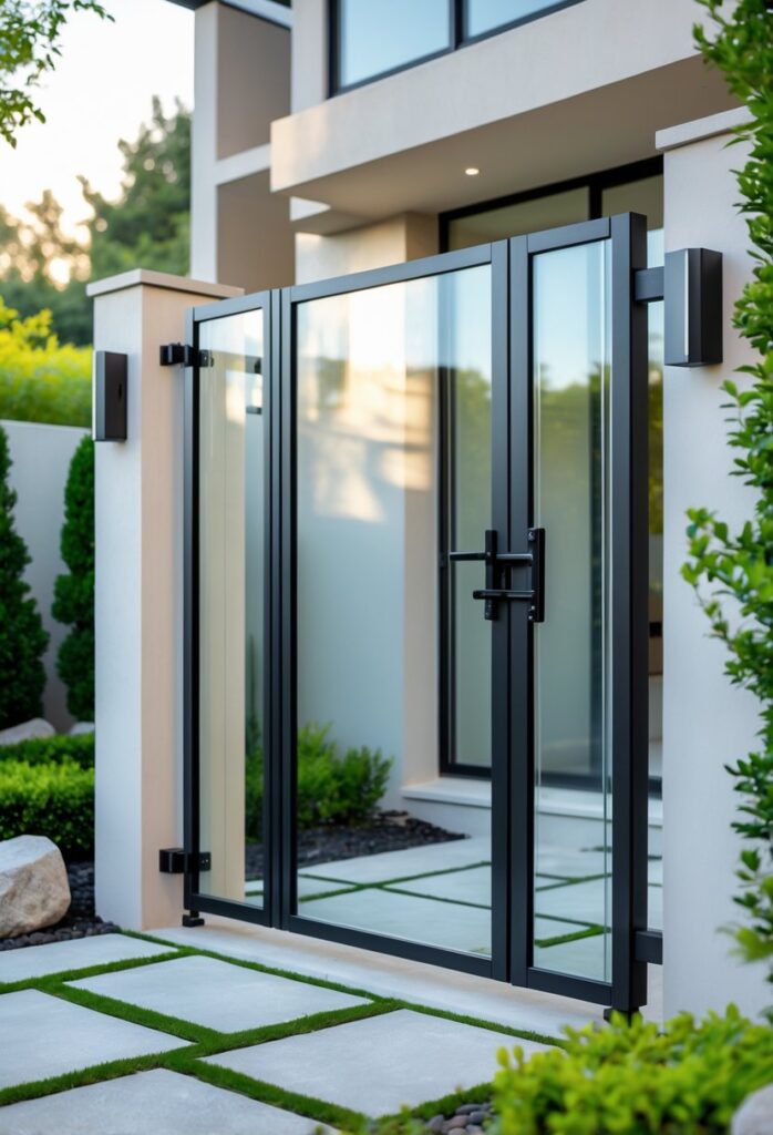 Glass panel gates pair well with minimalist landscaping or sculptural plants. Adding LED lights can highlight the gate and improve visibility at night. This kind of gate works best when the goal is to balance elegance and function in a modern outdoor spot.