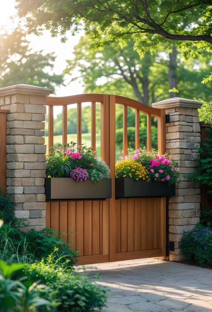 A gate with built-in planter boxes combines function and beauty in one feature. These gates often have planting boxes attached to the gate or gateposts. This allows flowers, herbs, or small vines to grow directly on the entrance.