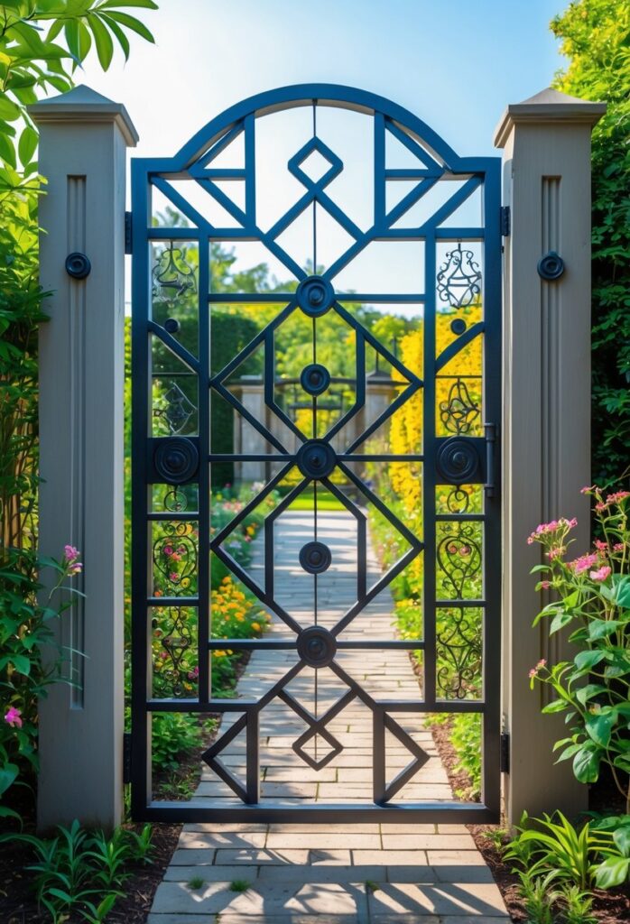 A decorative gate with geometric patterns adds a modern touch to any garden. It often features shapes like squares, triangles, or hexagons arranged in a repeating design. These patterns create visual interest without overwhelming the space.