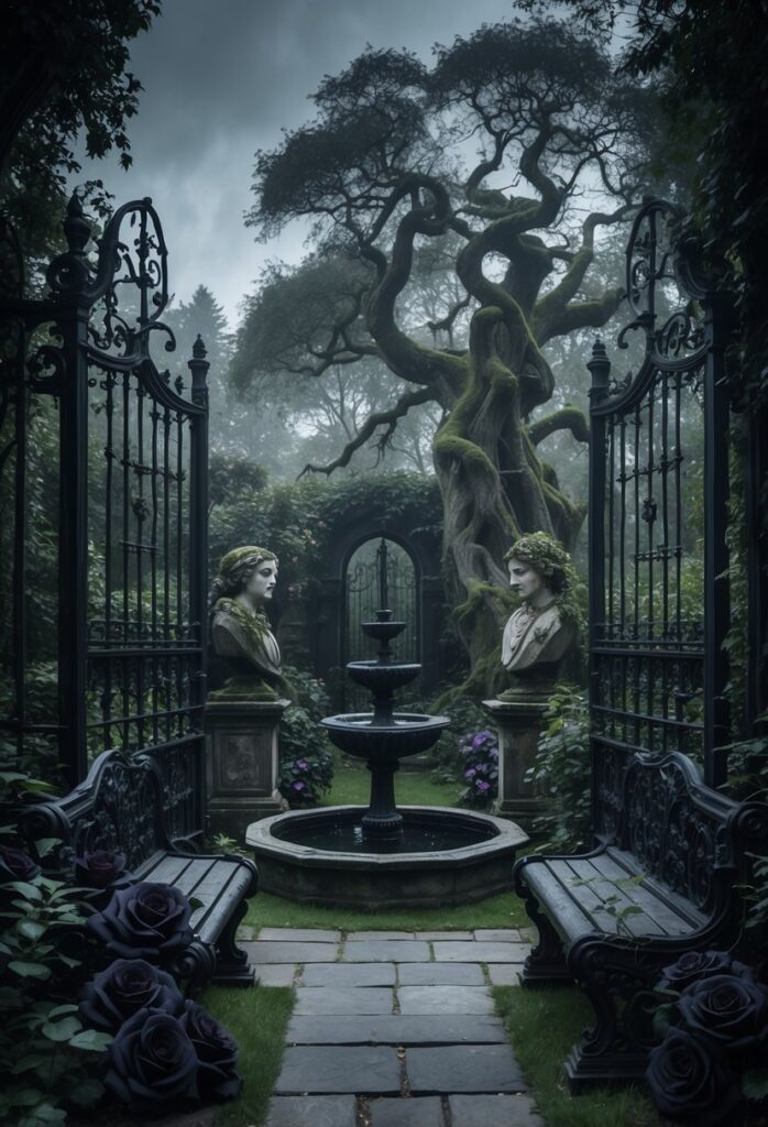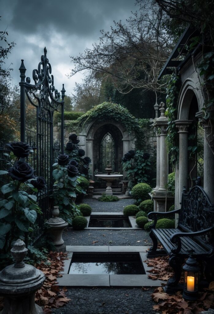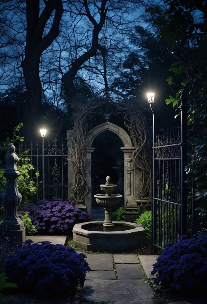 Lighting plays a key role in creating the gothic garden’s shadowy, dramatic effect. Installing low, soft lights along paths highlights statues and wrought iron gates without overpowering the dark theme.