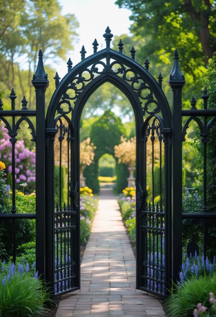 Wrought iron gates provide security while still allowing visibility, so the garden remains inviting but protected. They can be paired with stone walls or ivy-covered fences for a complete gothic feel.