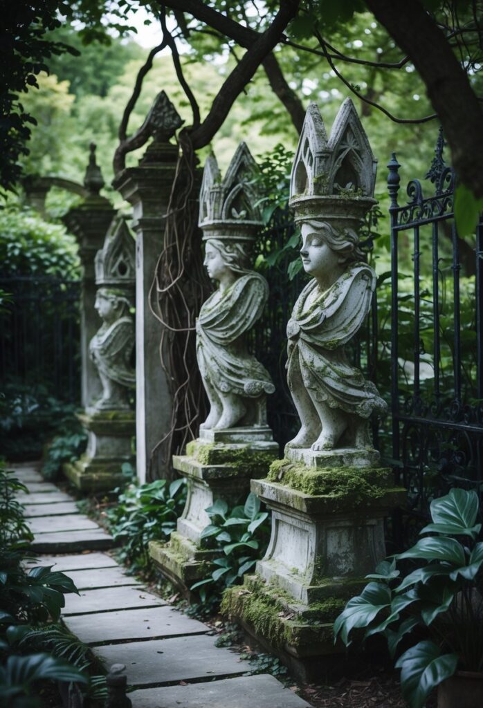 Using weathered stone statues combines art and nature. They add structure without overpowering the darker colors and designs typical in gothic gardens.