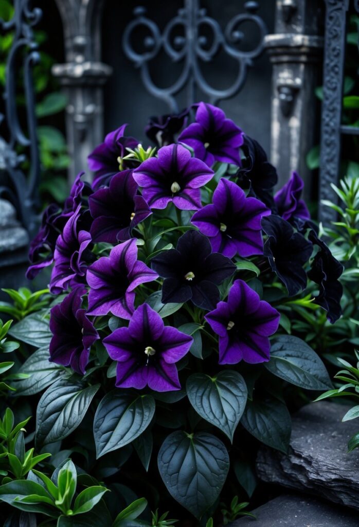 Other deep purple and black flowers can also create a similar moody effect. Combining these colors adds depth and a mysterious atmosphere to the space. For more ideas on using these flowers, see this guide on black velvet petunia plants for your gothic garden vibe.