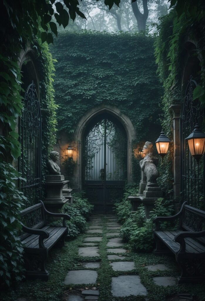 Black wrought iron gates create a strong first impression and frame the space. Weathered stone statues add vintage charm and a historic touch. Ivy-covered walls provide a lush, mysterious backdrop that ties the look together. Lantern-lit paths with vintage-style candle lanterns enhance the atmosphere in the evening.