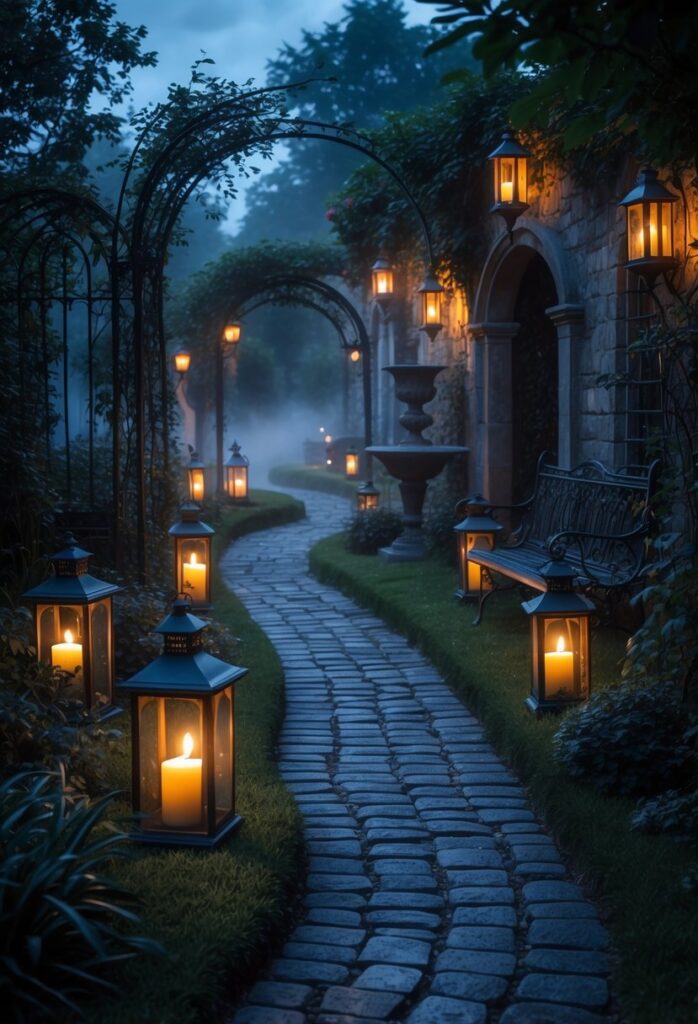 A path lined with vintage-style lanterns encourages slow walks and quiet reflection. It complements other gothic elements like black iron gates and ivy-covered walls. For more ideas, see lantern lighting in garden paths.