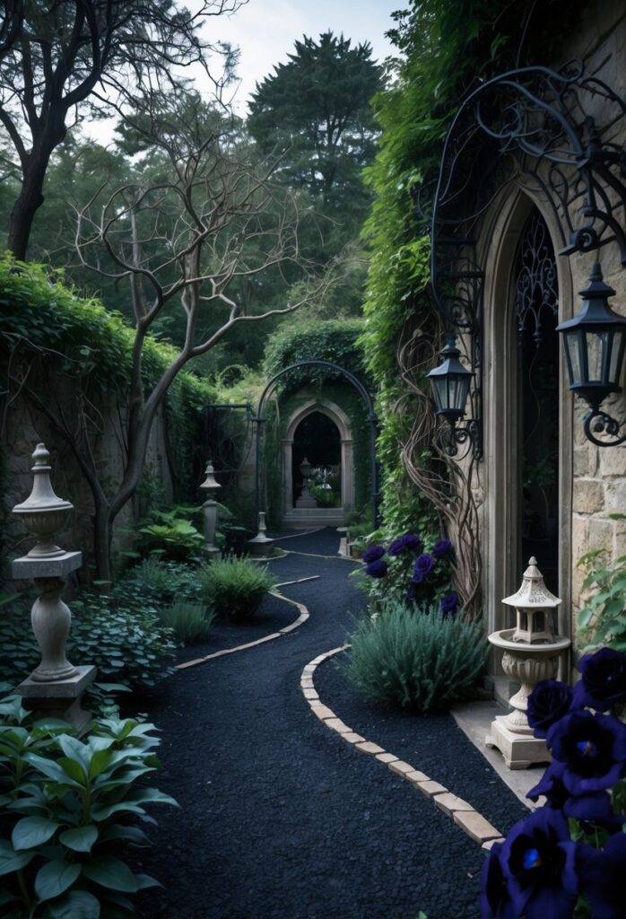 Dark-colored gravel or slate can add a strong visual impact to a gothic garden. These materials create a sharp contrast with green plants and bright flowers, making the pathways stand out clearly.