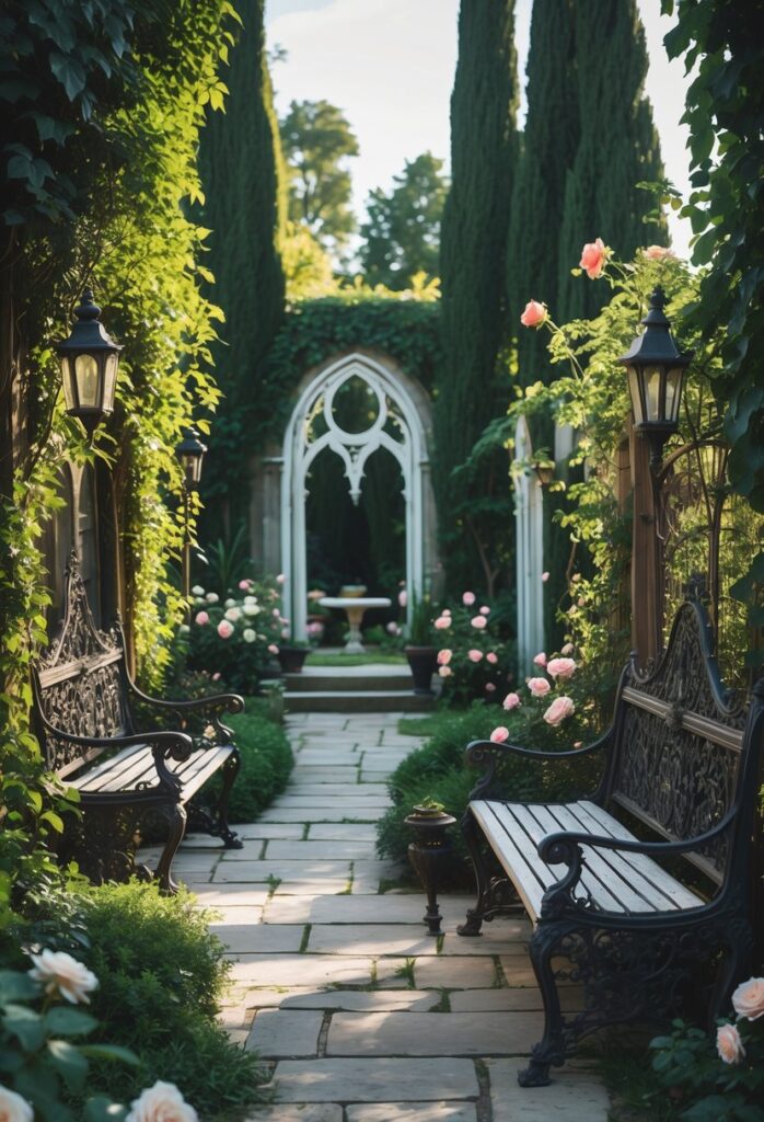 Wooden benches painted in deep colors like black or dark green also work well. They provide a classic, timeless look that matches gothic elements such as ivy or lantern-lit paths. Combining Victorian details with gothic colors brings a unique charm to outdoor spaces.