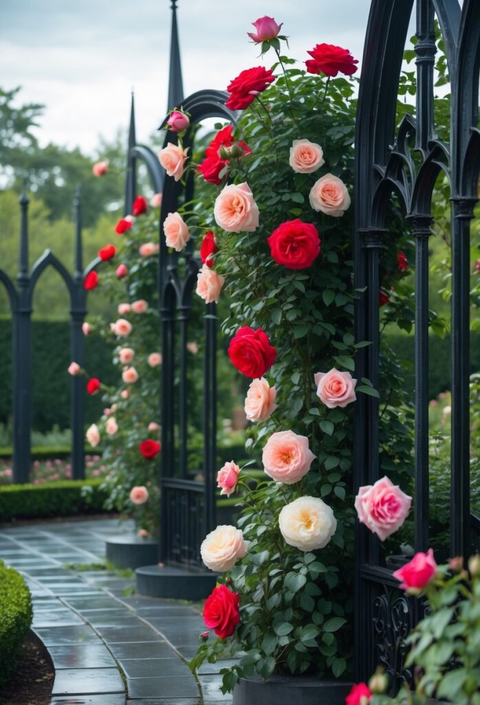 Climbing roses on these arches bring softness and color. Deep red or purple roses offer a rich contrast to the black metal. They add beauty while maintaining the garden’s dark, dramatic look.