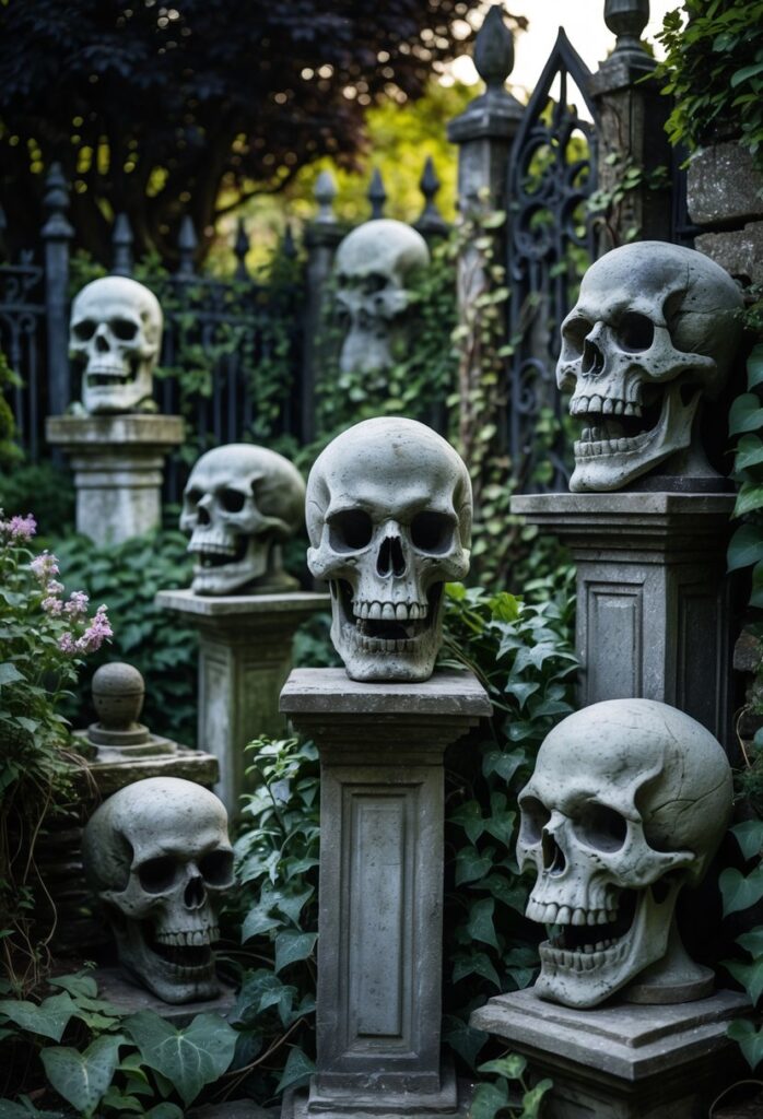 Skull and gargoyle sculptures add a strong gothic touch to any garden. They create a sense of mystery and history that fits well with darker garden themes. These sculptures often serve as eye-catching focal points.