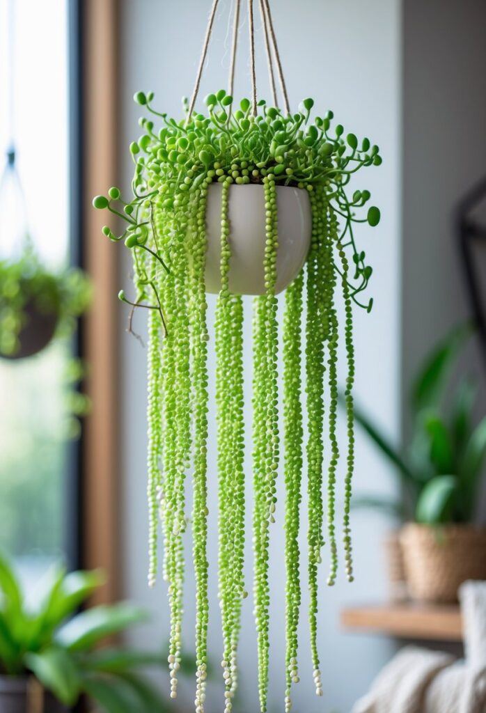 It stores water in its bead-like leaves, so it needs less frequent watering than many plants. It thrives in bright, indirect light and prefers well-draining soil. For more care tips and display ideas, see hanging String of Pearls suggestions.