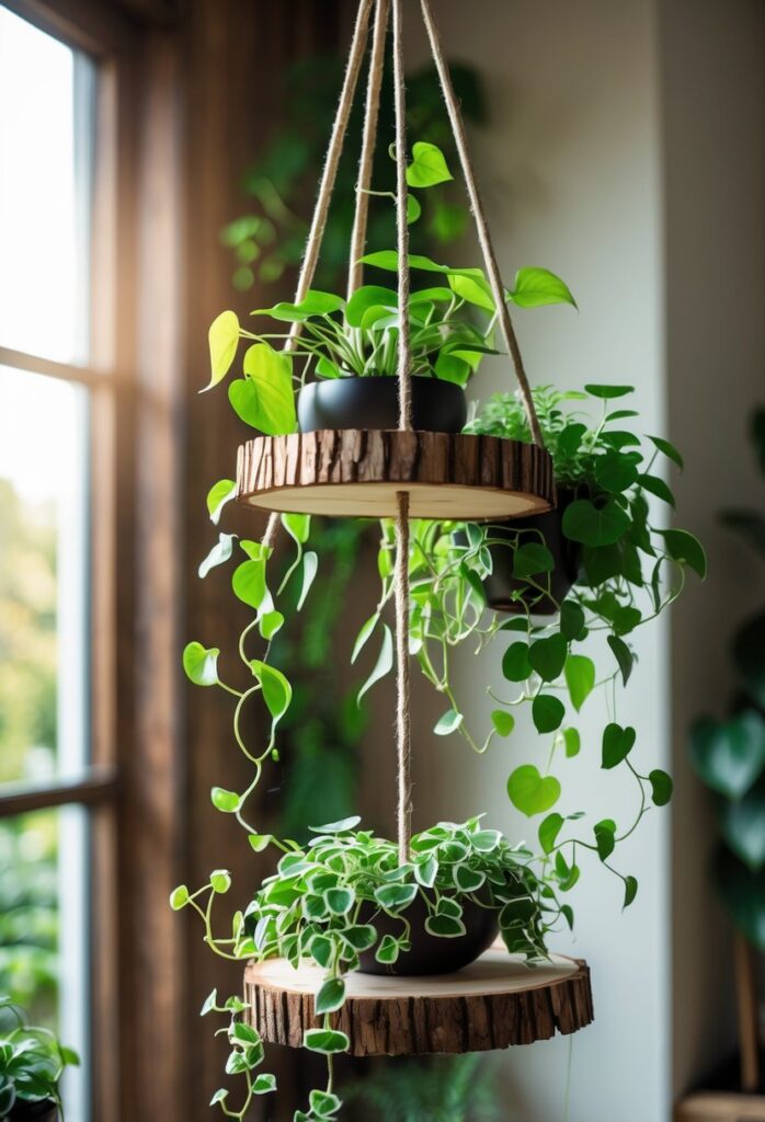 A hanging wood slice plant stand offers a natural, rustic look for displaying plants indoors. It is made by suspending a flat wood slice with ropes or chains, creating a simple, sturdy platform.