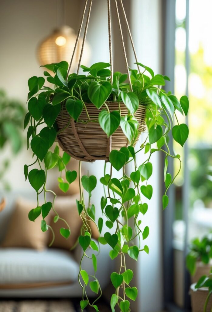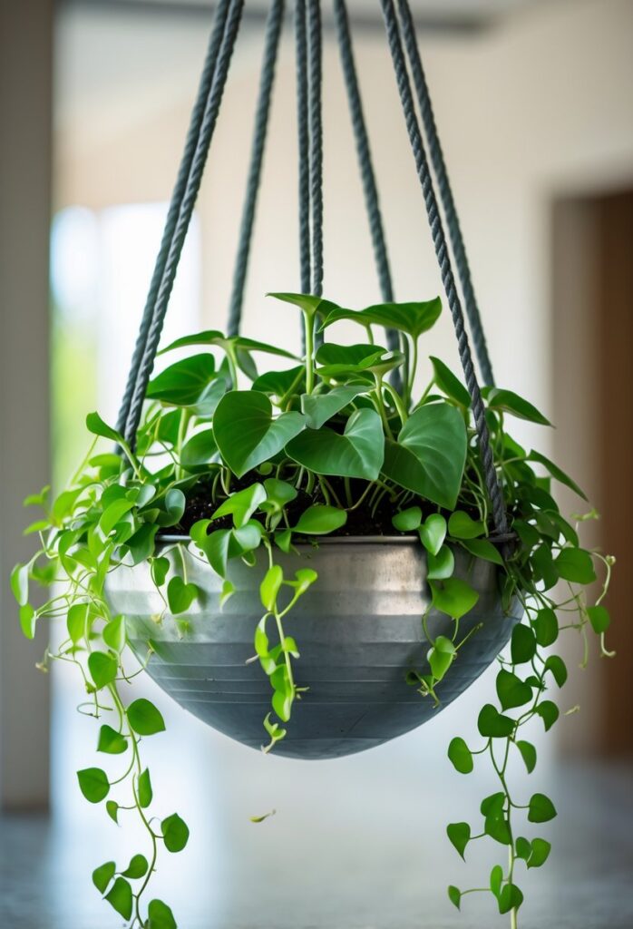 People often hang pothos in baskets or place them on shelves where the vines can cascade down. This plant fits well in many styles, from modern to bohemian. It is easy to grow and keeps a space feeling fresh and green. For more ideas, see creative ways to display pothos indoors.