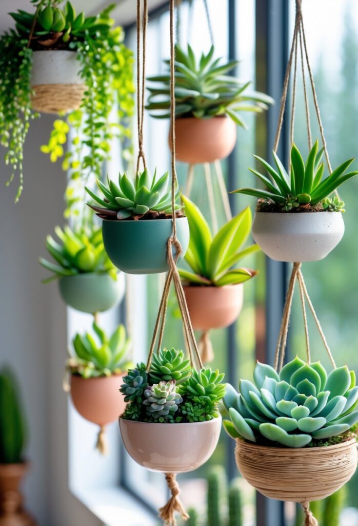 Succulent hanging gardens are a smart choice for anyone who wants low-maintenance greenery. These plants store water in their leaves, so they need less frequent watering than other types.