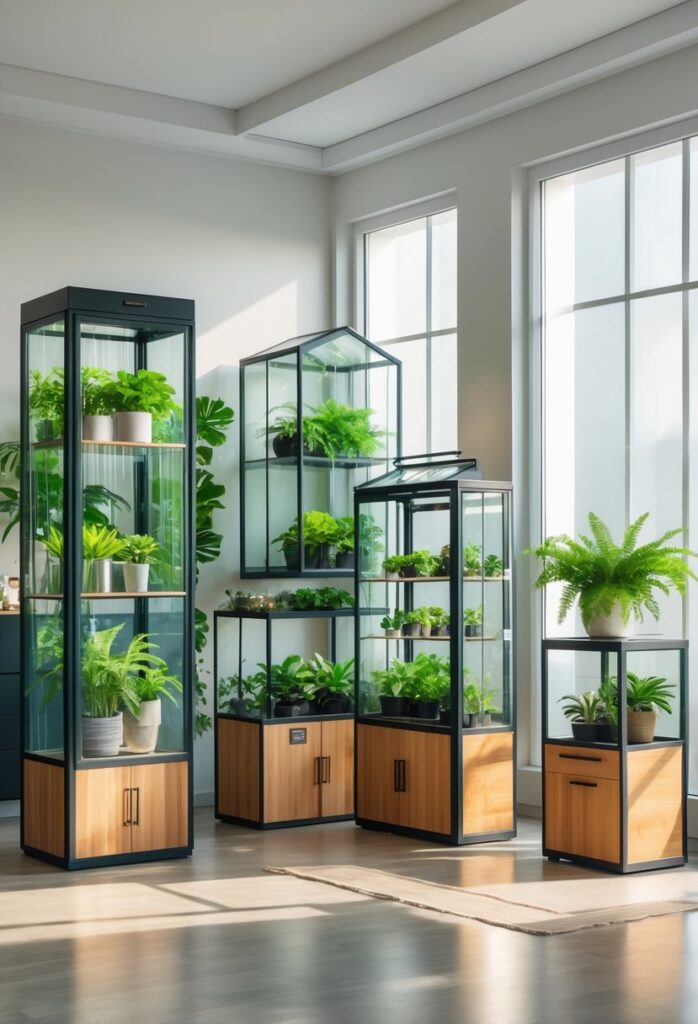 Built-in storage and shelving keep everything organized, minimizing clutter. Clear glass panels enable light to reach all plants evenly. These cabinets often double as attractive furniture pieces, seamlessly blending with interior decor.