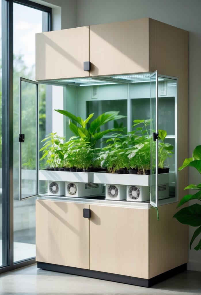 Small fans improve air circulation inside the cabinet, preventing mold and keeping plants healthy. Adding a temperature and humidity gauge allows easy monitoring of the climate. This setup creates a stable environment suitable for delicate or tropical plants. For more details, see this guide on how to turn an IKEA cabinet into an indoor greenhouse.