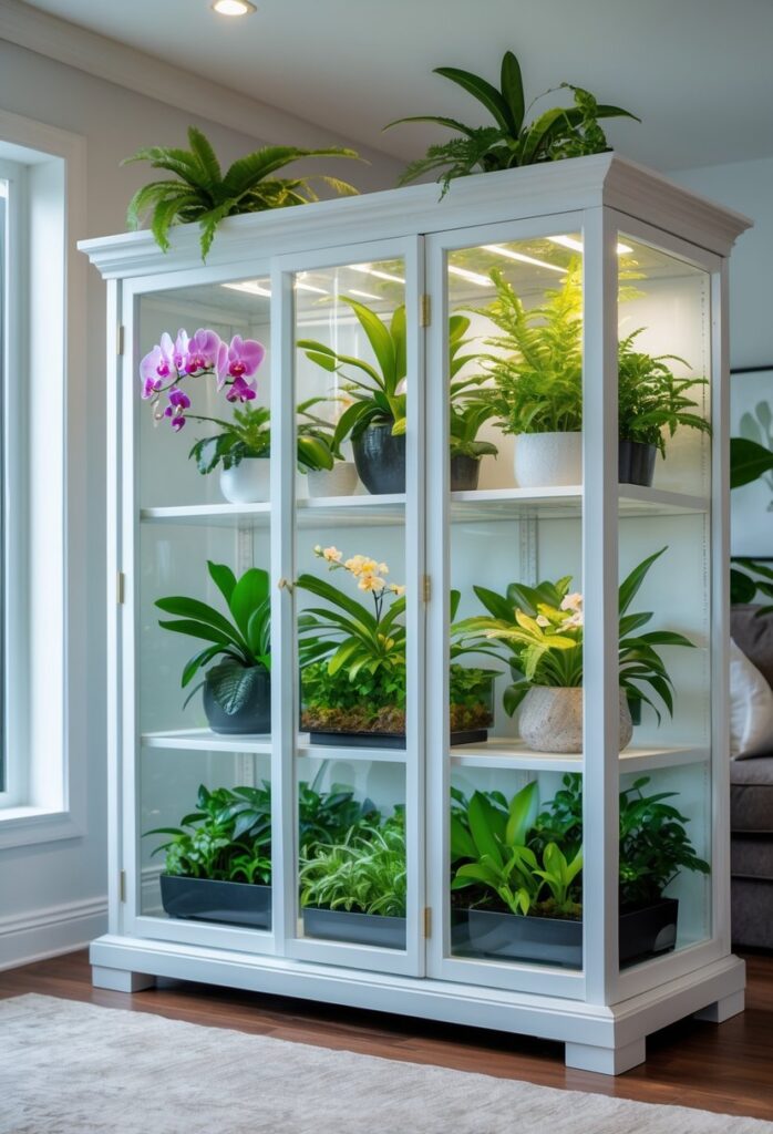 The cabinet also keeps plants safe from pets or children. Adjusting shelves inside allows for better organization and height control. Using a cabinet like this is a practical way to maintain a stable environment for sensitive tropical species. For guidance on this idea, see how others have transformed china cabinets into greenhouses.