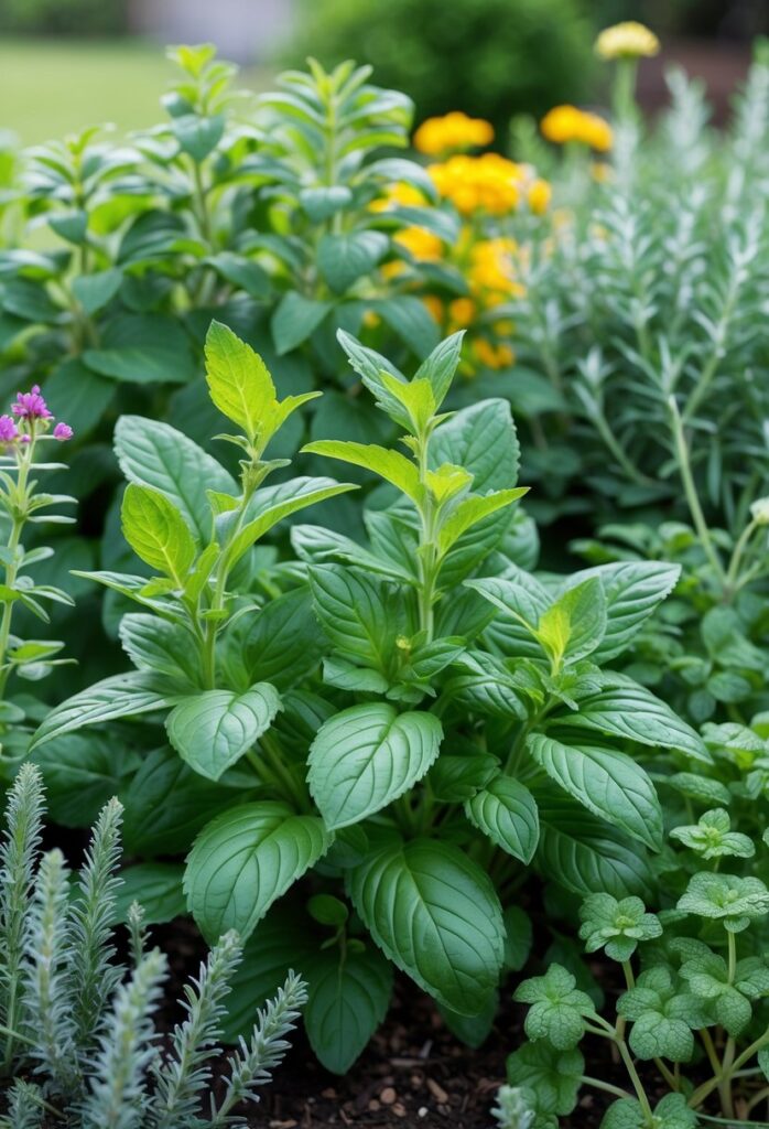Mint grows well in partial shade and repels mosquitoes with its strong scent. Some varieties of basil can tolerate shade too. These plants are good options for yards where sunlight is limited.