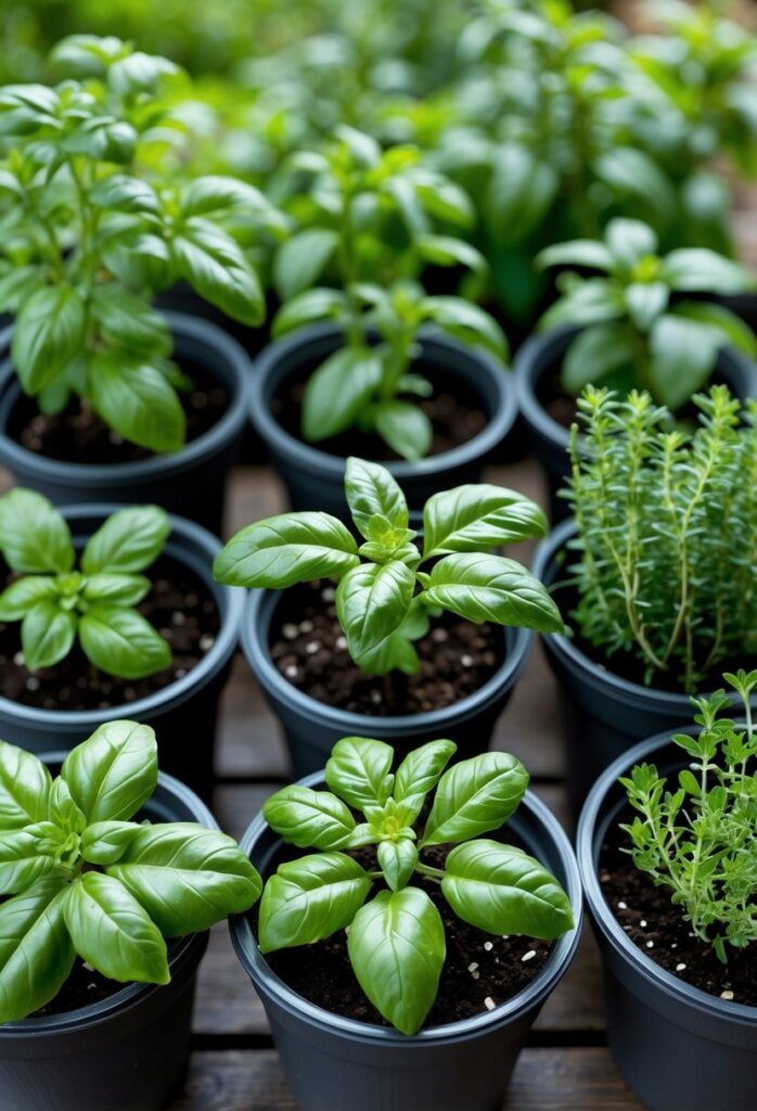 Basil and thyme are popular herbs that grow well in pots. They are perfect for small vegetable gardens or balconies where space is limited.