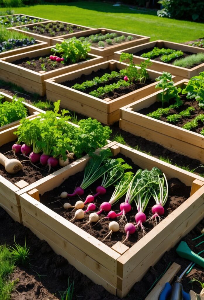 Root crops like carrots, beets, radishes, and turnips do well in raised beds. These beds provide enough depth for roots to develop fully without hitting hard soil or rocks.