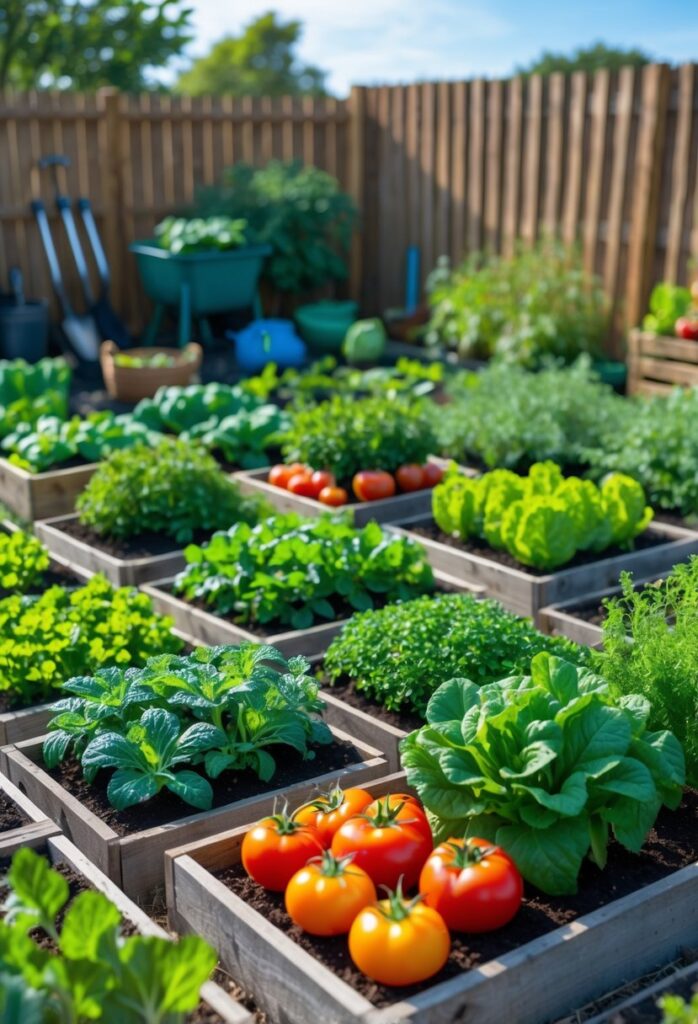 Planning includes selecting the right crop mix and layout. Raised beds for root vegetables, containers for tomatoes, and vertical supports for beans make the best use of the space. Regular watering and soil care keep plants healthy and yields high.