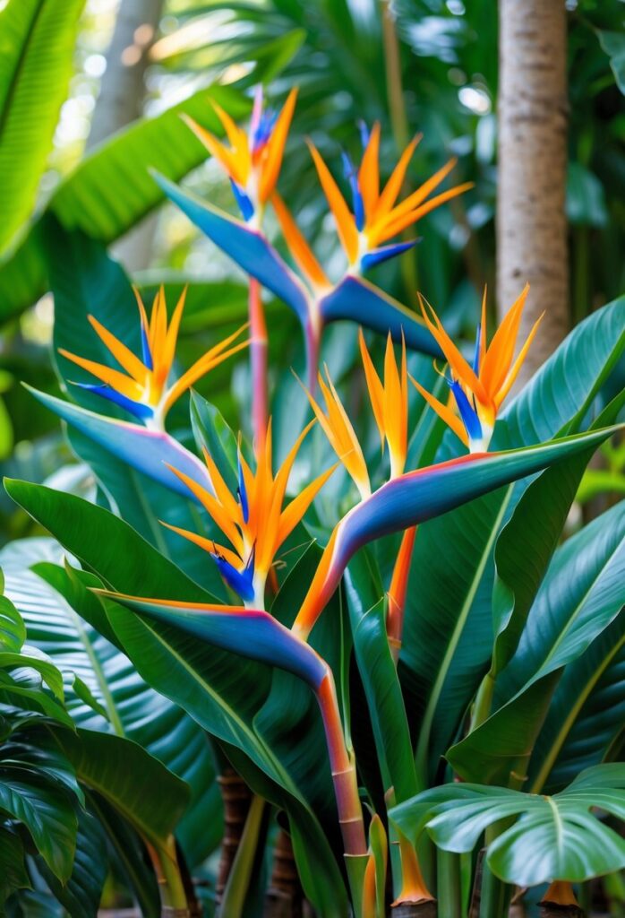 The Bird of Paradise, or Strelitzia, is a tropical plant known for its bright, colorful flowers. Its blooms look like a bird in flight, with striking orange and blue petals. It adds a tropical look to gardens and indoor spaces.