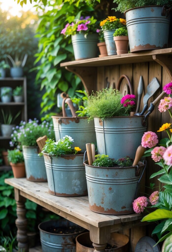 For ideas on using weathered metal buckets in a garden setting, see creative ways to add rustic charm with vintage buckets.
