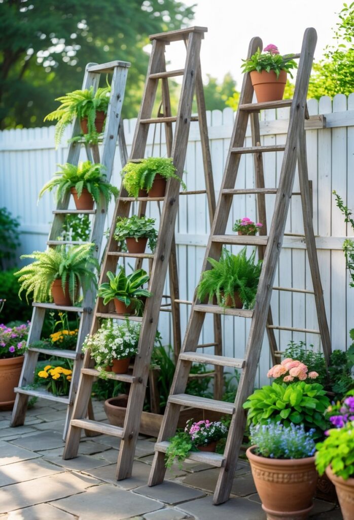 Using vintage ladders as plant stands is practical and attractive. It turns old items into useful garden decor. For more ideas, see creative ways to use vintage ladders for plant displays.