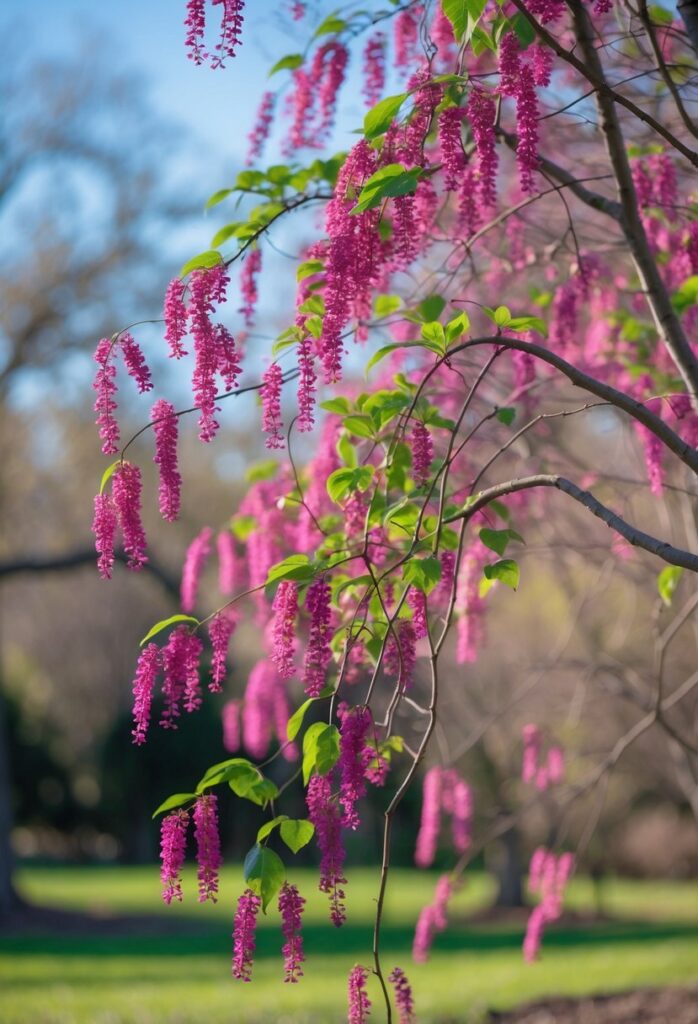 In early spring, it produces clusters of rosy pink flowers that cover bare branches. The heart-shaped leaves follow, forming a dense, umbrella-like canopy. Its twisted, contorted branches add visual interest throughout the year. The tree thrives with minimal care once established.