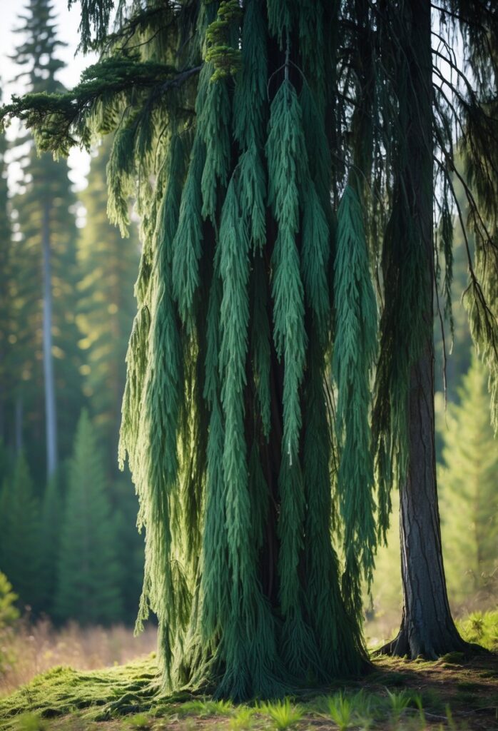The Weeping Alaskan Cedar is an evergreen tree with a slender trunk and drooping branches. Its blue-green needles hang in flat sprays, creating a soft, elegant look.