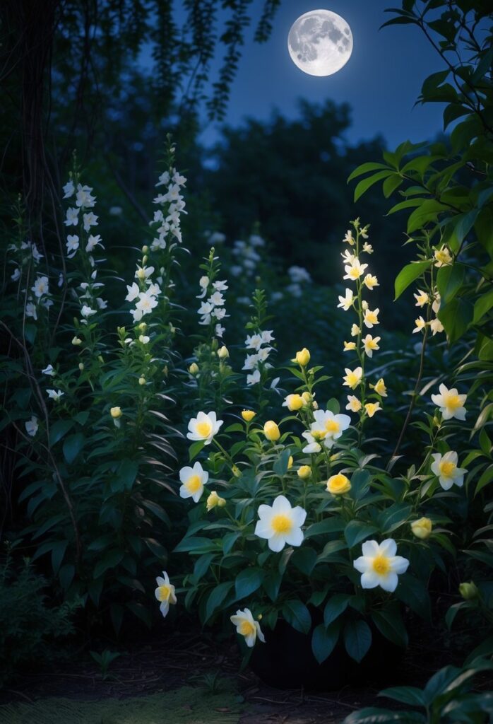 Jasmine gives a sweet, calming smell. Evening primrose offers soft yellow flowers and attracts birds at night. Moonflowers open their white blooms in the evening, creating a glowing effect.