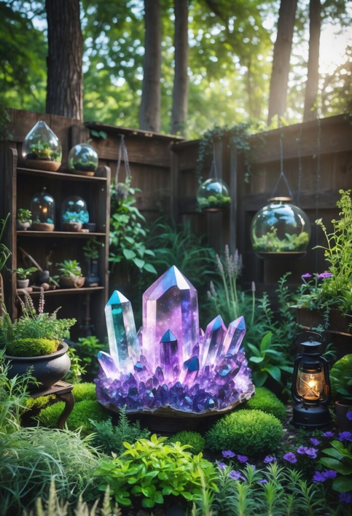 Using crystal clusters as focal points adds natural beauty and interest to the garden. Larger clusters or geodes can serve as eye-catching anchors in different areas.